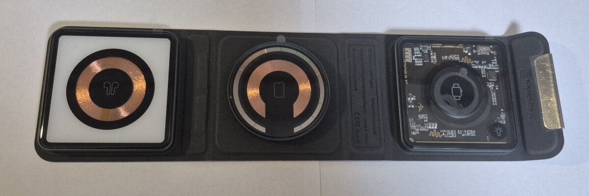 Murray 3-in-1 무선충전기는 닫았을 때 작은 지갑처럼 보이는 트라이폴드(3 Folding)형태인데 두 번을 펼치면 얇은 패널형태로 펼쳐집니다. 가장 오른쪽에 2.5W 속도로 스마트워치 충전부가 있고, 가운데는 최고 15W로 스마트폰을 고속충전할 수 있으며, 왼쪽 끝에는 5W속도로 이어폰을 무선으로 충전할 수 있도록 3개 충전부를 가지고 있습니다.